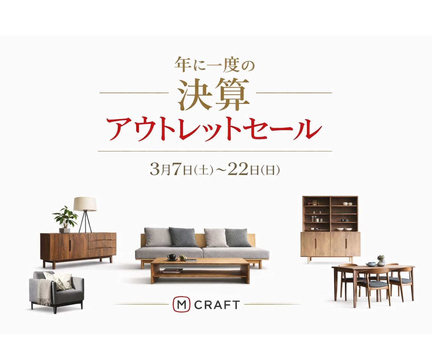 3月7日(土)〜22日(日) 年に一度の決算アウトレットセール 2026.03.05 マルケイ木工ショールームでは、年に一度の決算アウトレットセールを開催いたします。 期間中は、ショールーム展示商品がアウトレット特別価格でご購入していただけます。 無垢のダイニングテーブルや人気のソファ、TVボード・ベット・シェルフ・チェストなど たくさんのアイテムがご覧いただけます。 商品は、展示現品1展限り・数量限定となりますのでぜひお早めにお越しください。 この機会にぜひショールームにお越しください。